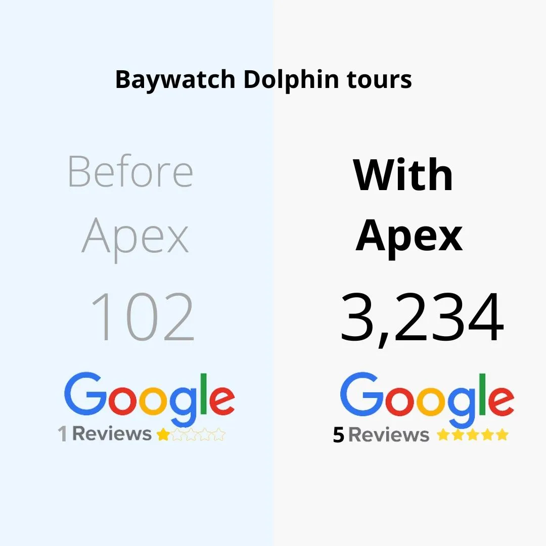 Thanks to APEX Solutions Pro, BayWatch Dolphin Tours has seen a massive increase in 5-star reviews and improved online visibility. Their seamless review request system—via text and email—made it effortless to collect feedback from happy customers. With AI-driven insights, we can better understand our guests' experiences and continue to enhance our services. The boost in positive reviews has not only strengthened our reputation but also attracted more bookings. If you're looking to grow your business and dominate your industry with stellar ratings, APEX Solutions Pro is a must-have!